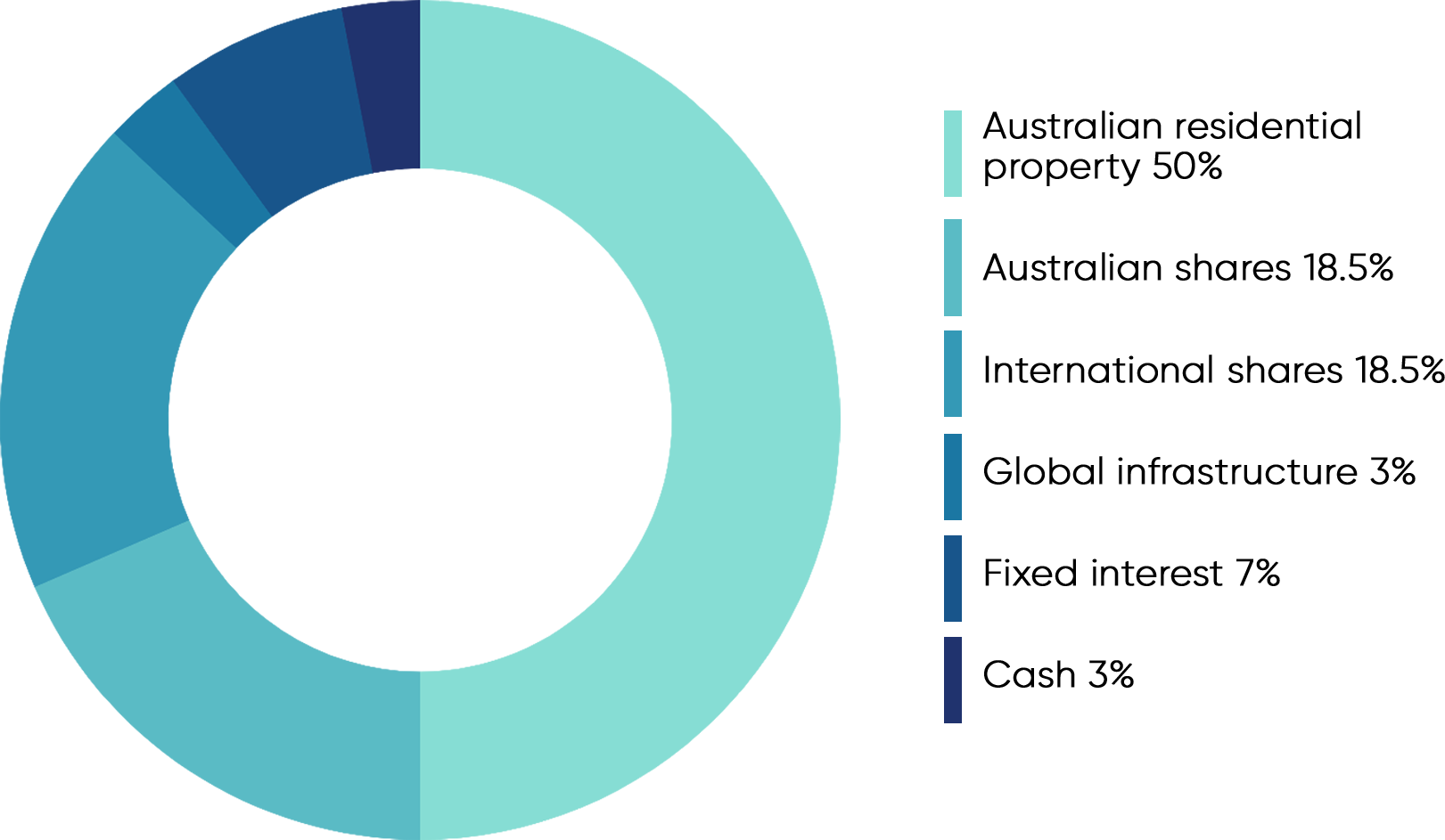 Growth Property has a strong bias towards growth assets, such as Australian residential property, Australian and international shares with a smaller offsetting allocation towards defensive assets such as fixed interest securities and cash.